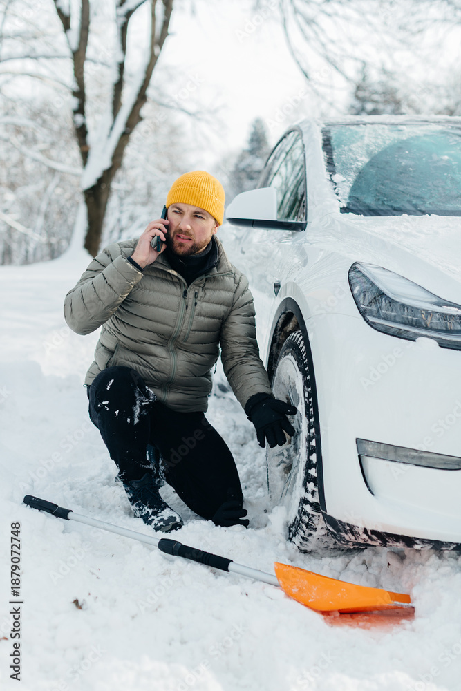 Electric car driver calling for winter roadside assistance