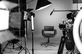 Empty film studio set with green screen and production equipment
