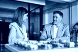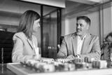 Real estate developers brokers presenting new residential city building development construction luxury housing project architectural model. Investing in realty, bank mortgage loan concept.