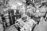 Industrial engine room with pumps, pipes, valves and machinery, showing complex mechanical and power systems inside a vessel.