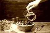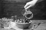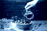 Woman adding tasty apple vinegar to salad with vegetables on table