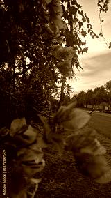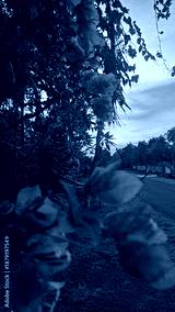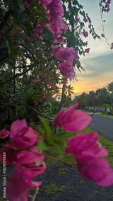 Beautiful bougainvillea plant with pink flowers color and colorful sunset view along the country road. Vertical composition. Palasari village, Negara - Bali, Indonesia