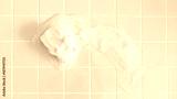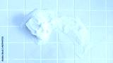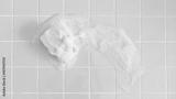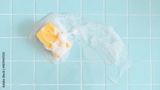 Yellow sponge with soap suds on light blue tiled backgrond. Sponge and soap create a clean, fresh look. Soap bubbles on tiles, sponge cleaning effect. Sponge on pastel blue tiles, cute background.