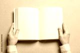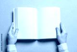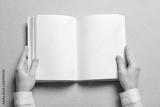 Woman holding book with blank pages on light background. Mock up for design