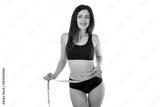 Fit woman measuring waist and hips with tape wearing black sportswear isolated on white