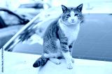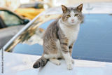 Cat on car hood resting under daylight, outdoor scene featuring cat, car, pet and animal in a calm urban setting, sunlight highlights fur and curious gaze