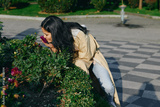 Woman in beige jacket leans toward flowering shrub, smelling blossoms on a garden path, an outdoor moment highlighting nature, casual style and serenity.