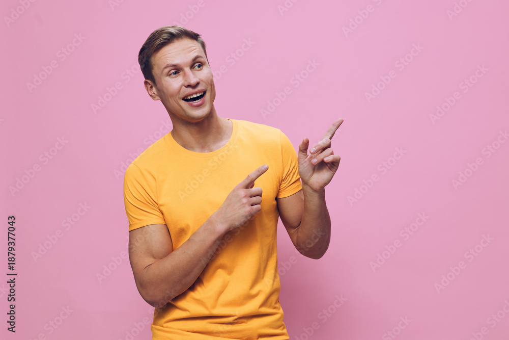 Smiling man with short brown hair wearing casual yellow t-shirt pointing to the side with an enthusiastic expression on a pink background, studio portrait, people lifestyle concept, cheerful mood