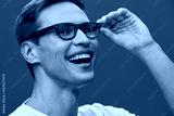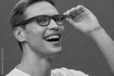 Close-up of smiling happy young caucasian man wearing glasses looking at camera holding in hand, casual style, joyful expression, studio portrait, gray background, lifestyle concept, cheerful mood