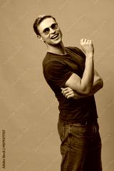 Vibrant young man with short hair wearing sunglasses, casual teal t-shirt, jeans, smiling broadly and showing excitement, standing against a bright blue background. People lifestyle concept, joyful