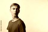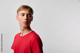 Young man in a red shirt appears in side profile against a neutral studio background, captured with clean studio lighting, fashion photography vibe, and a calm contemplative mood for modern style and