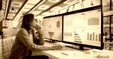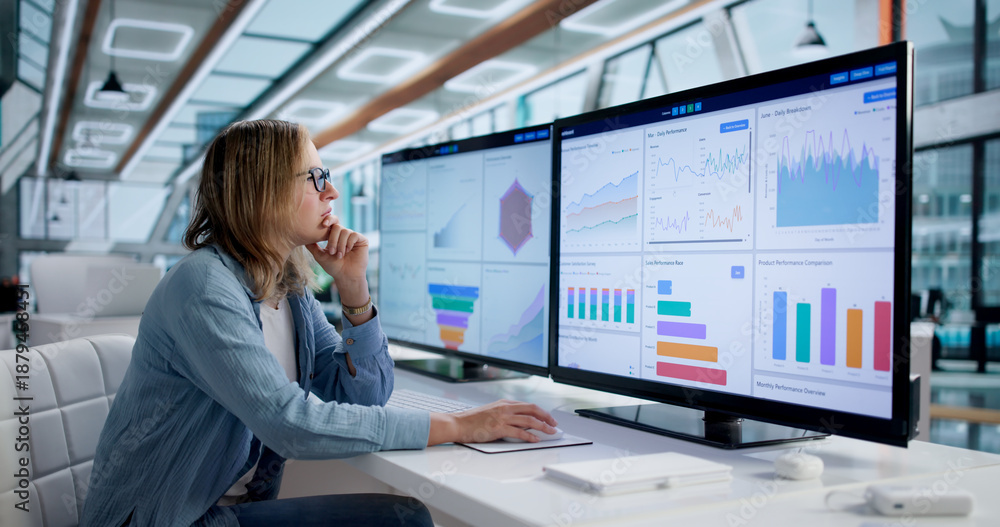 Young Caucasian Woman Analyzing Finance Data On Desktop Screen