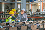 Industrial Factory Workers Wea Safety Helmets and Vests Analyzing Manufactu Processes Using Laptop in Modern Production Facility