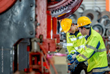 Two male factory workers wea safety helmets and high visibility jackets working together in an industrial manufactu plant with metal pipes and machinery environment
