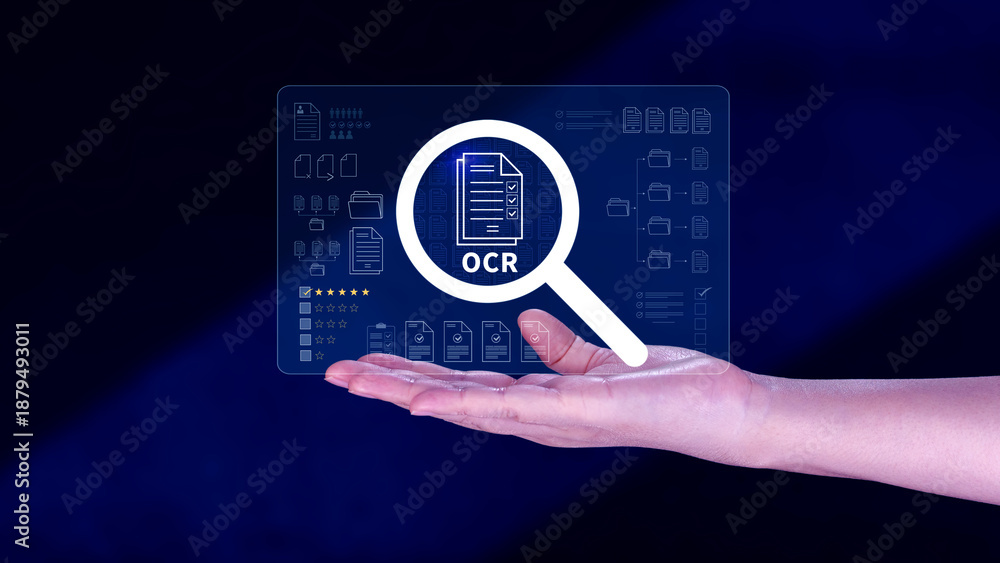 OCR technology concepts. using AI powered OCR with virtual interface, representing intelligent document scanning, text recognition, automation processing tools. not ai
