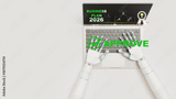 An AI robot work with laptop seek business plan timeline 2026 and target goal floating on screen