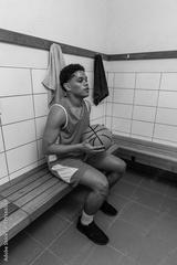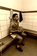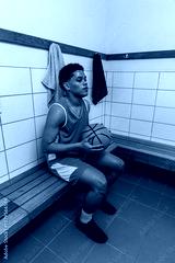 African american teenage male athlete wearing jersey sitting in locker room with basketball