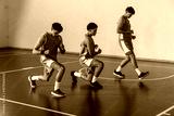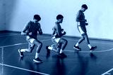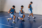 African american male teammates doing front lunges on basketball court in blue jerseys, sneakers