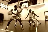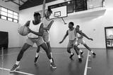 African american male athlete wearing yellow bib pivoting and protecting basketball on court