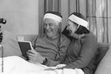Senior couple sitting on couch in living room wearing Santa hats reading book with Christmas bauble