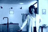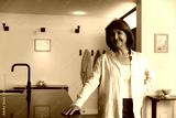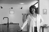 Middle-aged woman leaning on kitchen island in modern kitchen with sleek black faucet, copy space
