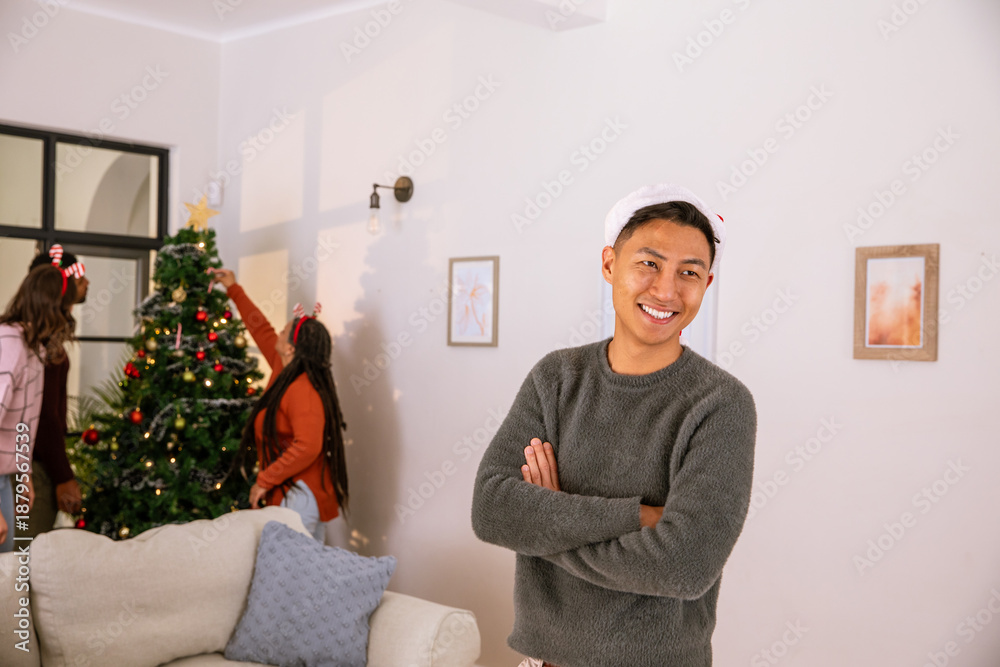 Diverse friends in santa hat trimming christmas tree placing star in living room, copy space
