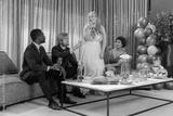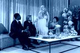 Diverse wedding party raising rosé glasses at reception lounge, bride in gown, bread on table