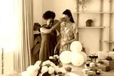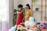 Diverse female friends wearing dresses playing peekaboo in living room behind table with balloons