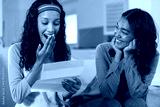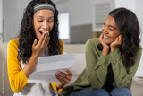 Diverse mom and teenage daughter sitting on couch in living room reading letter smiling