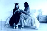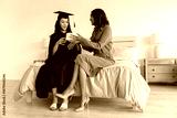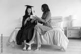 Diverse mom and teenage daughter exchanging small gift box while wearing graduation gown in bedroom