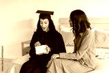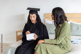 Diverse mom and teenage daughter opening white gift box in bedroom wearing graduation gown