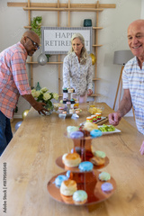 Senior friends arranging cupcake stand, balloons under happy retirement sign in dining room