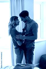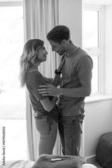 Couple embracing and gazing beside window in bedroom with purple cap pregnancy test on blanket