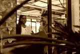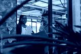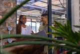 Diverse coworkers reviewing documents, laptop at glass partition under ductwork near brick wall