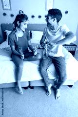 Couple on bed opening sparkling wine bottle in bedroom with string lights and pink throw