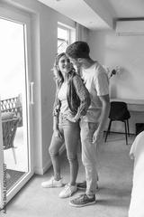 Couple embracing near sliding glass door in bedroom with balcony wicker chairs and desk flowers