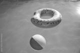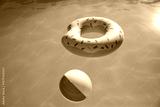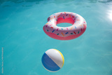 Pink donut float hovering on pool with striped ball under reflecting sunlight
