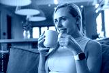 Woman holding ribbed ceramic mug next to face and gazing right in open-plan living room, copy space