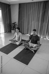 Diverse couple in athletic wear practicing seated meditation in living room with black yoga mats