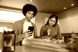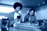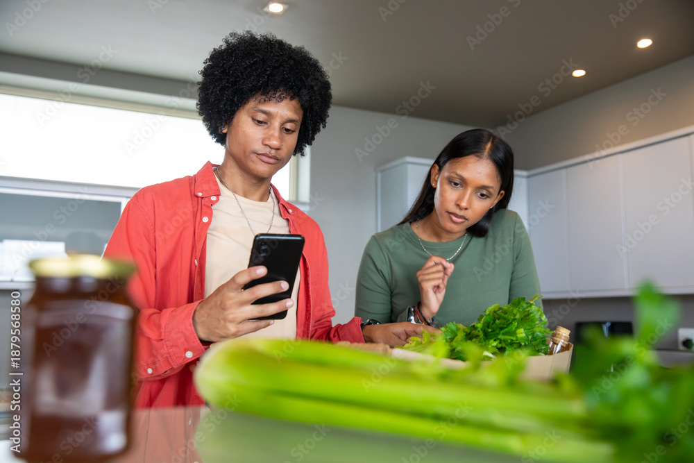 Diverse couple inspecting fresh herbs in wooden crate, scrolling smartphone at kitchen island