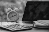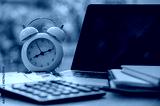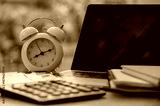 Alarm clock with laptop, calculator and notebook on desk representing time management, productivity, deadlines and business planning concept
