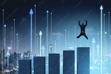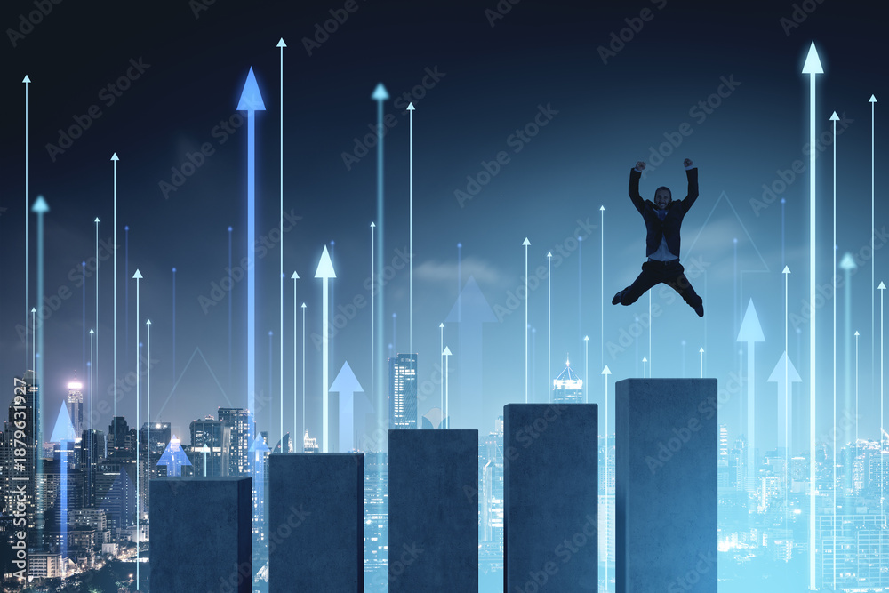 Businessman jumping for success on growing bar chart with city b