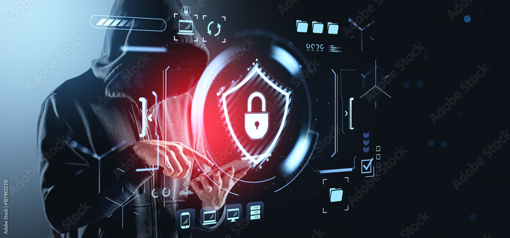 Cybersecurity concept with hooded figure using tablet and digita