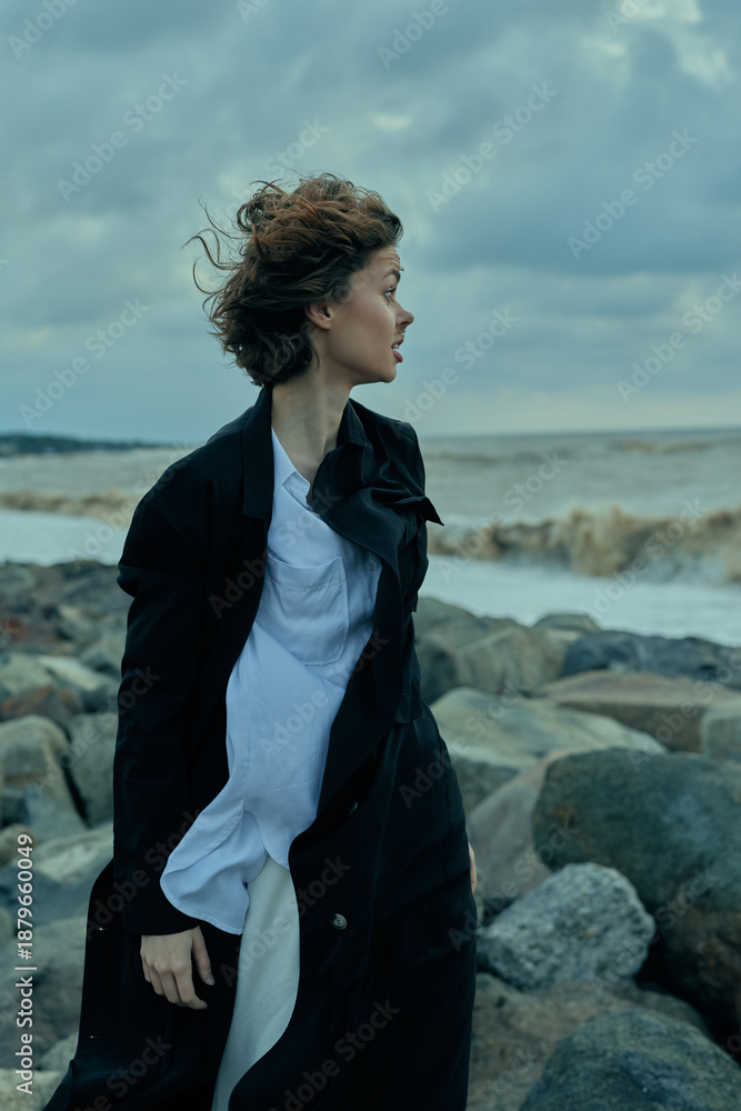 Windy coastal scene with a woman in a long coat standing among rocks as waves crash, creating a moody fashion moment by the sea
