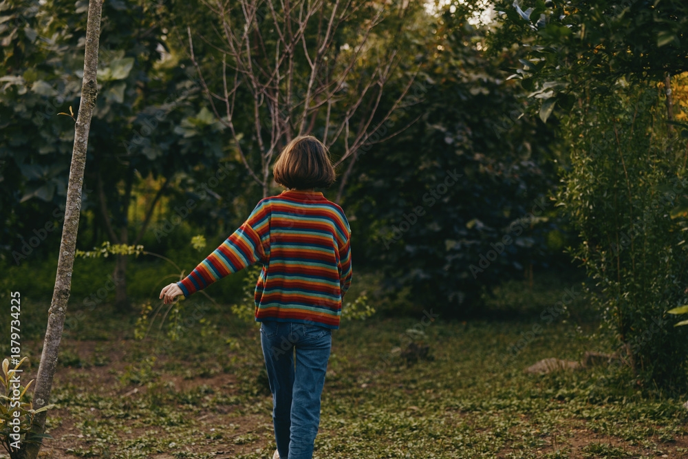 Child 9-year-old with short brown hair in a colorful striped sweater walking on a forest path, casual outfit and jeans, back view exploring peaceful nature and greenery.
