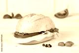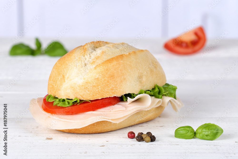 Brötchen Sandwich Baguette belegt mit Schinken auf Holzbrett