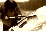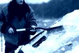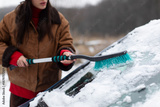 Closeup shot of woman removing snow from car windshield with brush, vehicle parked in rural winter setting