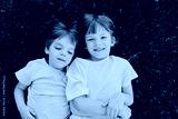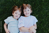 Two happy children lying on green grass, smiling joyfully while enjoying a sunny day outdoors. Their playful expressions radiate warmth and innocence.