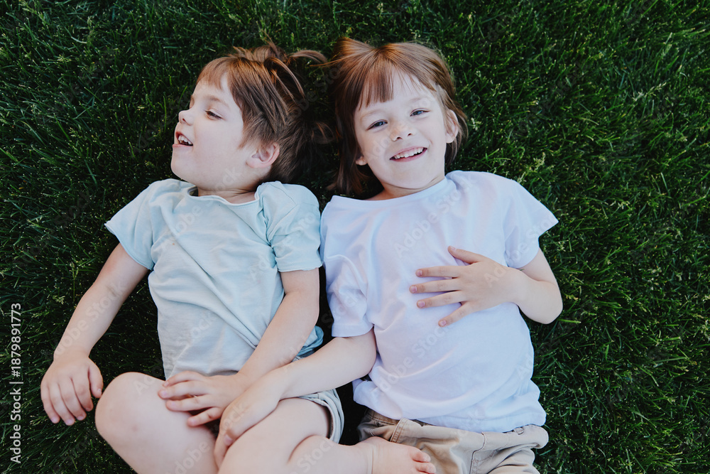 Happy children lying on grass, enjoying a sunny day with joyful expressions and playful poses, perfect for capturing the essence of childhood joy.