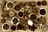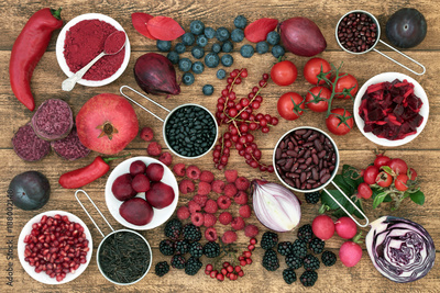 Health food with fruit, vegetables, grain and pulses high in anthocyanins, antioxidants, minerals and vitamins on rustic oak background. Healthy eating concept. Top view.